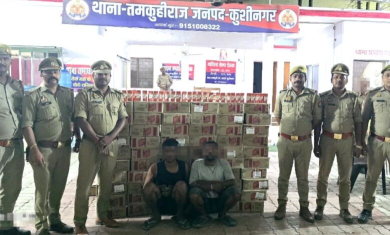 तमकुहीराज, कुशीनगर। पुलिस अधीक्षक कुशीनगर संतोष कुमार मित्रा द्वारा अवैध शराब बिक्री निष्कर्षण परिवहन के विरुद्ध चलाये जा रहे अभियान के क्रम में शनिवार को थाना तमकुही राज पुलिस टीम द्वारा थाना तमकुहीराज क्षेत्रांतर्गत बाला जी डाबा के सामने एनएच-28 के पास से एक अदद टाटा ट्रक WB 25 D 3928 से तस्करी कर बिहार हेतु ले जायी जा रही कुल 153 पेटी टेढ़ा पैक अंग्रेजी शराब (वाहन सहित कुल कीमत लगभग 37 लाख रुपये) के साथ 02 शराब तस्करों जिनकी पहचान रंजन कुमार पुत्र रामजन्य राय निवासी अख्तीयारपुर थाना पूरनों जिला मुजफ्फरपुर विहार और सचिन कुमार पुत्र राजेन्द्र दास निवासी आनन्दपुर गंगोलिया भाना सरैया जिला मुजफ्फरपुर बिहार के रूप में हुई है।