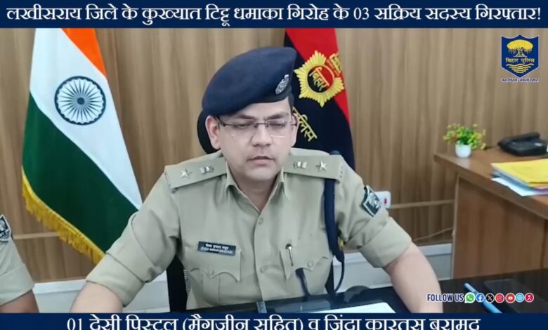 बिहार,मुंगेर पुलिस ने गुरुवार को टिट्टू धमाका गैंग के तीन सक्रिय सदस्यों को गिरफ्तार किया है। मुंगेर एसपी सैयद इमरान मसूद ने प्रेस कॉन्फ्रेंस में यह जानकारी दी।पुलिस को गुप्त सूचना मिली थी कि गैंग के सदस्य बरियारपुर से नीली बाइक पर अवैध हथियार लेकर तेलिया तालाब की ओर आ रहे हैं।