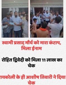 आशीष तिवारी नाम के व्यक्ति ने युवक को चेक सौंपते हुए कहा है कि अब जो कोई स्वामी प्रसाद को जूते से मारेगा उसे 21 लाख रुपए से सम्मानित किया जाएगा. साथ ही उन्होंने कहा कि सनातन धर्म का अपमान बिल्कुल बर्दाश्त नहीं किया जाएगा.